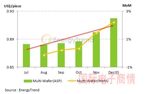 另一方面,由于第四季多晶硅交易價(jià)格已站上US$17.0/kg,加上多晶硅片的需求持續(xù)攀升,主要業(yè)者的產(chǎn)能維持滿載,替價(jià)格調(diào)漲創(chuàng)造有利的條 件。除此之外,高效多晶硅片的市場(chǎng)已經(jīng)出現(xiàn)供不應(yīng)求的狀況,EnergyTrend調(diào)查,十二月臺(tái)系相關(guān)業(yè)者已全數(shù)向外尋找委外代工的產(chǎn)能,以應(yīng)付持續(xù)涌入的需求。經(jīng)歷一段準(zhǔn)備期后,硅片業(yè)也于第四季開(kāi)始調(diào)整價(jià)格,2014年一月的平均價(jià)格上看US$0.98/piece到US$1.02/piece 之間。