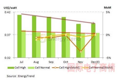 全球市場(chǎng)研究機(jī)構(gòu)TrendForce旗下綠能事業(yè)處EnergyTrend表示,由于上游多晶硅與多晶硅片價(jià)格漲勢(shì)仍未停止,電池業(yè)者為因應(yīng)不斷攀升的生產(chǎn)成本,醞釀再次調(diào)漲售價(jià),以平均售價(jià)US$0.4/watt為近期目標(biāo)。