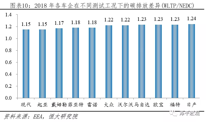 3)測試標準更嚴:2021年開始執(zhí)行WLTP測試標準,相比NEDC測試標準而言,WLTP測試標準測試距離長、周期多、速度快,更接近實際。根EEA發(fā)布的2018年歐盟乘用車測試數(shù)據(jù)顯示,WLTP標準下乘用車碳排放相比NEDC平均高出21%左右,主流車企測試結果顯示高出15%-24%。