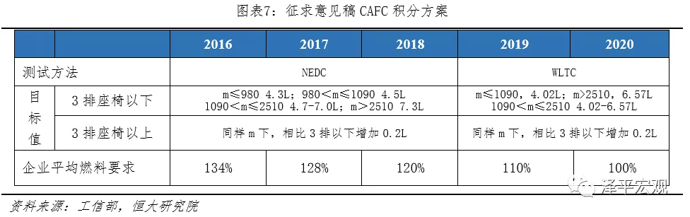 1)傳統(tǒng)燃油車油耗趨嚴,鼓勵發(fā)展低油耗車型。新《積分辦法》將傳統(tǒng)燃油車測試方法從NEDC調(diào)整為WLTC工況,中汽中心數(shù)據(jù)顯示其油耗將較NEDC工況惡化10.6%。此外,燃料消耗量目標值下調(diào)10%左右。