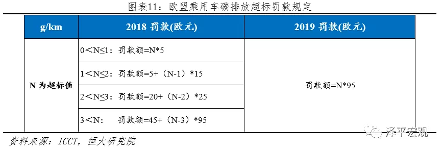 4)罰款力度更重:2018年根據(jù)碳排放具體值分階段處罰,但是從2019年起全部按照最高標準處罰,每超標1g/km罰款95歐。2018年歐盟范圍內(nèi)注冊新乘用車碳排放平均值121g/km,銷售1562萬輛;假設2020年碳排放和銷量保持不變,需要罰款(121-95)×1562×95=385.8億歐元。