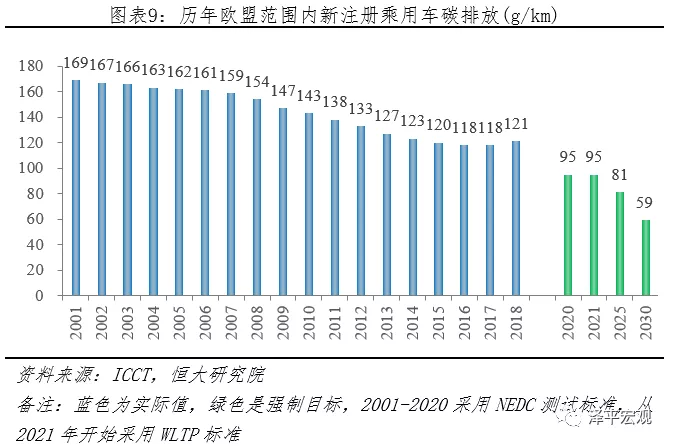 1)目標值降幅大:2021年開始采用新測試標準WLTP,乘用車排放不得高于95g/km,2025年、2030年分別在2021年基礎上減少15%、37.5%。據(jù)國際清潔交通委員會(ICCT)披露,歐盟乘用車企實際碳排放從2001年169g/km下降到2018年121g/km,年均降幅僅1.9%。