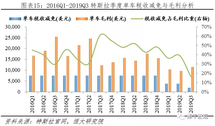 據特斯拉財報披露,2019Q3公司汽車銷售毛利率21.78%,單車毛利11525.77美元,稅收減免占毛利比重16.27%,稅收減免取消后,預計降低毛利率3.54個百分點。