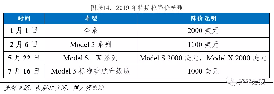為抵御稅收減免沖擊,2019年1-7月特斯拉四次降價。以特斯拉為例,其2018年底在美國累計電動車銷量超過20萬輛,從2019Q1開始,其單車稅收減免從7500美元減少到3750美元;自2019Q3開始,其單車稅收減免從3750美元減少到1875美元;2020Q1稅收減免取消。為抵御稅收減免下調帶來的購置成本增加,特斯拉分別在2019年1月、2019年2月、2019年5月、2019年7月四次降價。