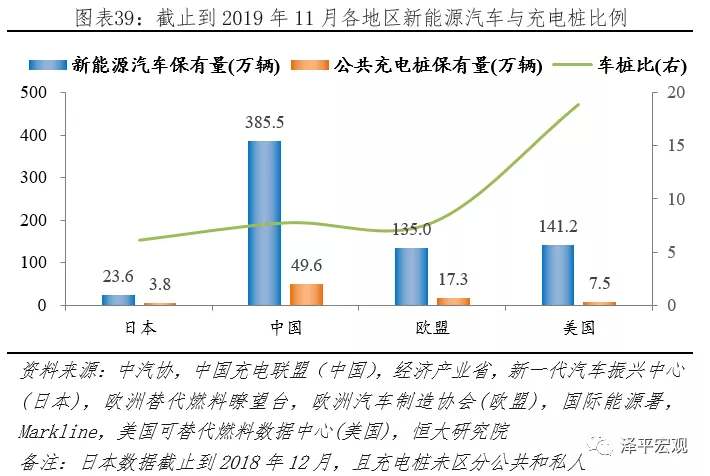 截止到2019年11月,據中汽協、中國充電聯盟統計,中國新能源汽車、公共充電樁保有量分別為385.5萬輛、49.6萬個,對應車樁比7.77:1;據ACEA、歐盟替代燃料瞭望臺統計,歐盟新能源汽車、公共充電樁保有量分別為135.0萬輛、17.3萬個,對應車樁比7.78:1;據Markline、美國可替代燃料數據中心統計,美國新能源汽車、公共充電樁保有量分別為141.2萬輛、7.5萬個,對應車樁比18.88:1。截止到2018年12月,據日本經濟產業省披露,日本新能源汽車保有量23.6萬輛;據新一代汽車振興中心披露,充電樁保有量3.8萬個,對應車樁比6.15:1。