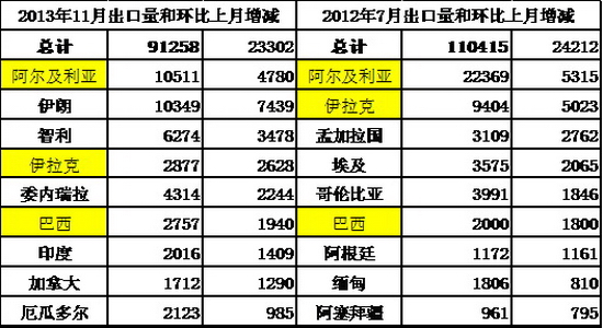 今年11月環比增長2.3萬臺;而12年的7月出口量突破11萬臺,環比增長2.4萬,可以與之相提并論。而今年的走強是年末走勢,這也是國內自主品牌走勢偏弱的時期。今年11月12年7月的環比增長的主要動力都是幾大主力市場的波動,尤其是阿爾及利亞和伊拉克、巴西等都是波動較大的。但今年 的伊朗波動更為巨大,11月1萬臺出口,環比增長7439臺。