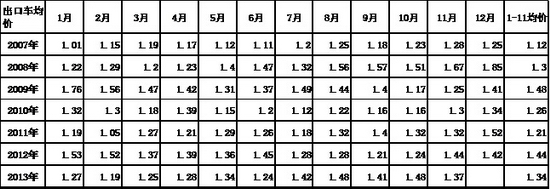 13年整車出口的均價大幅下降,這也是我們整車企業面臨的巨大壓力。13年1-3季度的出口車均價下降到1.32萬美元,較12年的1.44萬美元下降13%。這樣的單價下降幅度也是對整車企業的利潤的嚴重影響。我們的整車出口退稅是考慮價值的,出口的價值下降,企業的成本必然增大,而海外設廠組裝的成本增加,尤其是是初期的建廠投入等都較大,產能利用率也低,這對整車企業是很大的不利影響。