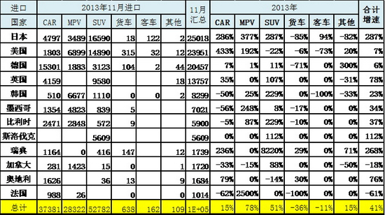 根據全國海關統計,2012年中國汽車整車進口113萬臺,增速9%,增長動力減弱。13年1-11月整車的進口107萬臺同比增速2%,進口在連續7個月暴跌后6月開始逐步回暖,7-10月基本保持穩定,11月大幅回暖。相對前幾個月減庫存狀態,11月的11.9萬臺的進口車持續說明需求相對恢復,零售目前也在10萬臺左右。