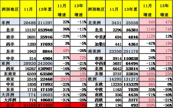 13年11月的汽車出口增長13%,其中歐洲和北美的出口出現高增長,而非洲也有恢復性增長,從區域看東非、南亞、東歐、北美、南美東部等出現較好的增長局面。