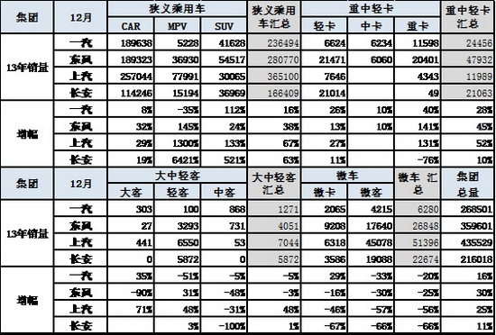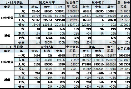 13年4大集團的表現差異不太大,這其中的乘用車表現反差較大,卡車等稍有彌補。一汽的乘用車暫時表現不強,而上汽和長安的乘用車表現超強,其中上汽的MPV、重卡表現較突出;一汽的卡車和客車表現較好,但轎車偏弱;東風的微車表現較強。