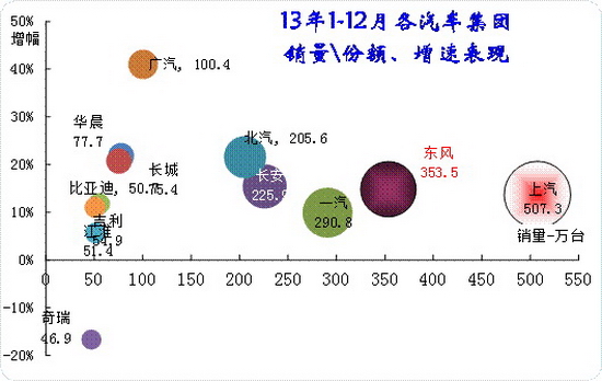 2、主要汽車集團13年累計銷量與12年同期的增長分析