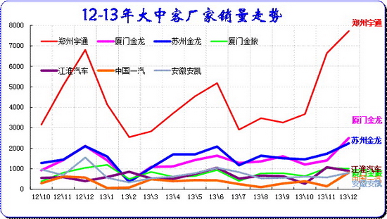 13年初春節因素的影響下的大客市場銷售出現季節性下滑,但由于柴油國四該實施的機會促進,6月的大客的市場暫時暴增,但新能源車補貼尚未出臺,加之校車等需求相對弱化,8-11月的大客市場相對低迷,12月的年末的銷售高潮出現,全國性霧霾導致改用清潔燃料的大客的需求仍是較大的。