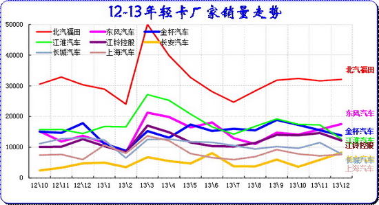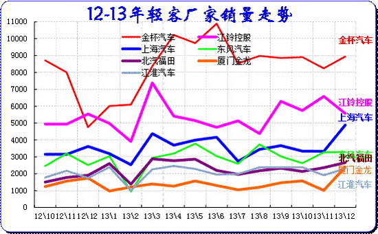 13年春節后的輕客走勢較強,主力企業小幅增長,二線企業大幅走強。8-12月的金杯平穩,江鈴走勢持續走強。而福田和廈門金龍的輕客走強,電商物流帶動中低端輕客表現較好。