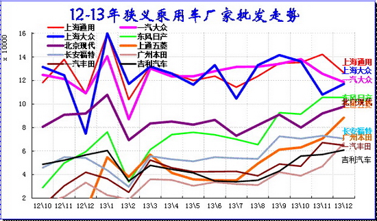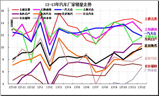 13年狹義乘用車銷量1637.8萬臺,累計增速19.9%;13.12月狹義乘用車銷量167.33萬臺,同比增長30.2%,環比增長6.2%。。13年12月的主力長銷量走勢仍是集群化特色較明顯,南北大眾和上海通用仍是核心的一陣營,日產和現代是二陣營,長安福特同比增37%屬強勢跟進,其他幾家合資企業也是環比微增。