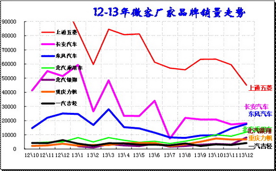 13年微客銷量155.35萬臺,累計增速-2.3%;13.12月銷量11.15萬臺,同比增長-32.9%,環比增長-4.2%。微客市場主力廠家全力轉型到MPV市場,部分微客高端需求也轉移到MPV,因此主力廠家表現相對較差。