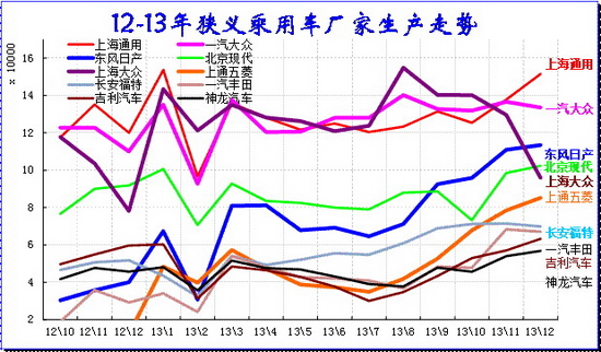 13年12月的廠家產銷競爭仍是較激烈的,走勢差異性大。日系主力企業相對12年同期逐步恢復元氣,東風日產持續超越北京現代的生產量。南北大眾的12月產量相對11月平穩,但一汽大眾的產量僅同比增9%,上海大眾增22%。 日系的東風日產和豐田、神龍、廣本都是環比11月的產量稍有增長,說明日系的增長是恢逆周期擴張。一汽豐田本月拉升較猛。