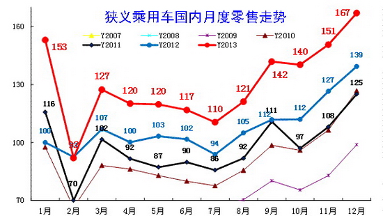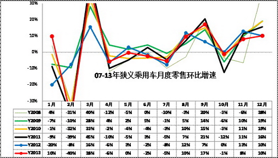 12年基本消化了近幾年諸多政策退出的不利影響的干擾,算是逐步進入正常走勢。13年1-12月狹義乘用車的環比零售增長特征與10年的走勢基本一致。12月的環比增速10%類似11年走勢。