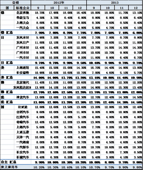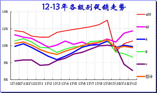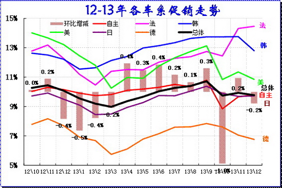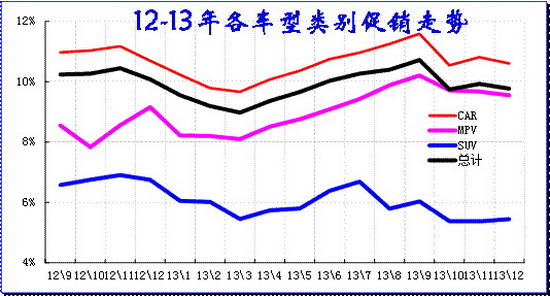 乘用車促銷總是循環前行,3月開始的新品推出和促銷逐步加大,一般來說3-9月連續都增長的。12年3-9月連續增長2.8個百分點是較強的。13年的促銷也是3-9月增加1.7個百分點,10月政策性收縮后11月促銷加大,但12月的促銷又開始微降。