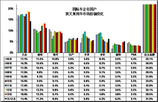 13年1-12月同比看,日系相對同期已經復蘇,因而其他車系份額是漲跌互相。大眾、通用、現代等幾大合資品牌表現都同比下降。日系三強的13年份額較同期持平,份額被福特、PSA分享。