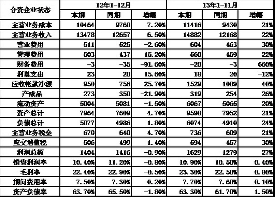 內資企業的12年總體運行狀態改善,13年初的利潤增長表現超強。12年1-12月的內資整車行業的銷售收入達到11693億元,同比增長4%。而12年的內資企業利潤表現也明顯改善,年利潤981億元,較11年1-12月增長97億元。13年的1-11月的內資企業利潤達到897億元,增長20%,這也是超預期的好日子。