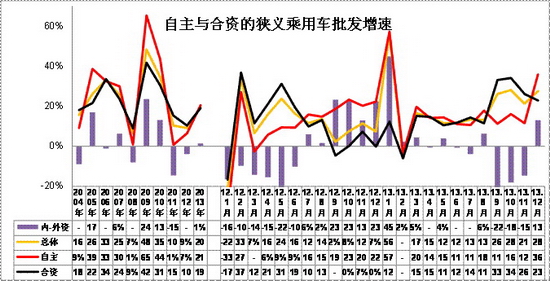 而12月的日系三強份額同比增長4%,其他車系中也是自主和韓系下降較大,自主份額相對12年12月下降2%。