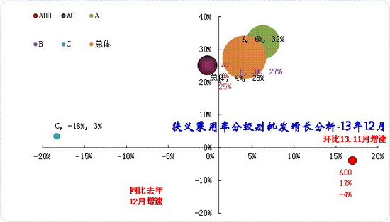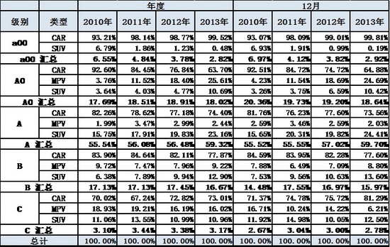 此表體現的是每一個細分類別占上一層級總零售量的比重,與包含出口和庫存變化的批發增長有所差異。也就是13年12月A0級別轎車占A0級乘用車的比例為64.9%,而A0級乘用車占狹義乘用車總量的18.6%。如果計算A0級別轎車占狹義乘用車總量的份額比重,應按65%*18.6%,計算結果是13%,相對年度份額仍有萎縮。