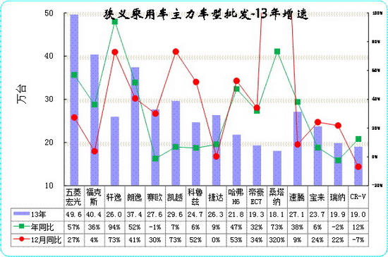 此表是按12月銷量排序列的的年累計銷量。2013年12月份狹義乘用車銷量排名前十位的車型品牌依次是:五菱宏光、??怂埂④幰荨⒗室?、賽歐、凱越、科魯茲、捷達、哈弗H6、帝豪EC7。 11-15名為桑塔納、速騰、寶來、瑞納、CR-V。