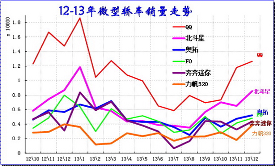 由于大城市限購,小城鎮喜歡大空間的,年輕人喜歡時尚品牌的,今年的微轎極其艱難,尤其是年末的微轎市場的反差巨大。13年底的微轎車型基本都比1月銷量高,而12年的很多車型12月銷量比11月低,這說明今年微轎車型沒有藏量的資源,也是市場較弱的表現。11-12月的QQ是在努力拉升銷量,而奔奔迷你也是出現小幅回升,沒有12年同期的大幅回調的現象。
