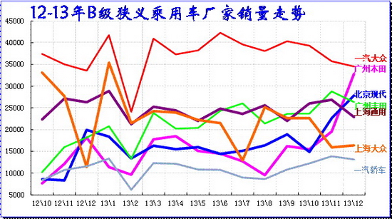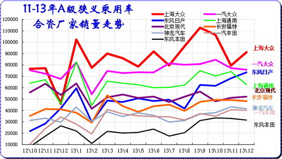 A 級車是合資企業超強的主力細分市場,主力廠家在此表現較強,尤其是9-12月的市場高潮期的A級車必然暴增,今年的合資主力企業增長相對去年稍好,去年過于保守。今年12月的主力廠家僅上海通用銷量稍有下降,其他廠家基本保持11月的水平。