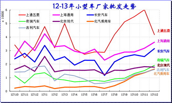 12月A級狹義乘用車批發97.36萬臺,12月占狹義乘用車批發份額59.38%,較去年同期份額增加2.13%,12月批發較去年同期同比增長32%,12月零售較去年同期同比增長25%;12月批發環比上月增長6%,12月零售環比上月增長11%;12月出口較去年同期同比增長32%;12月廠家產銷率101%,12月渠道批零率106%;13年1-12月生產累計增幅25%,13年1-12月廠家批發銷售累計增幅25%。