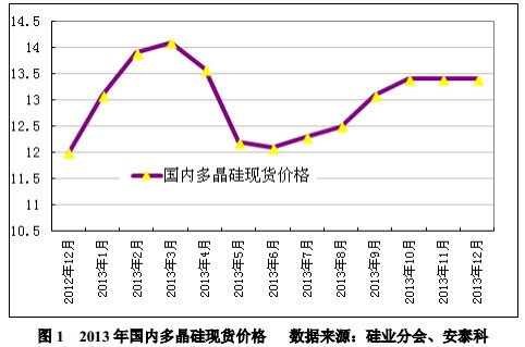 一、企業(yè)紛紛復產(chǎn)。受我國對美韓“雙反”初裁利好,到2013年底,國內(nèi)大約有13家多晶硅企業(yè)恢復生產(chǎn),國內(nèi)開工率達 30%以上。二、國外傾銷依舊。2013年1-11 月我國進口多晶硅量累計達7.2 萬噸,預計全年進口量達7.9 萬噸。進口均價方面,2013年1-11 月我國多晶硅進口均價為18.71 美元/千克,同比下滑 27.4%。可見國外傾銷依舊持續(xù)。三、價格低位徘徊。受國外傾銷影響,全國內(nèi)多晶硅現(xiàn)貨交易均價降至13 萬元/噸,同比下滑 16.7%。四、下游需求向好。國內(nèi)光伏配套政策陸續(xù)出臺,國內(nèi)光伏市場規(guī)模逐步啟動,預計全年光伏安裝量在9GW 左右。