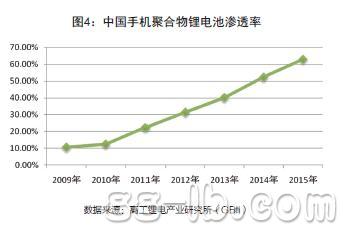 據(jù)高工鋰電產(chǎn)業(yè)研究所(G B I I)統(tǒng)計(jì),2 0 0 9年,聚合物鋰離子電池在手機(jī)電池中的應(yīng)用比例為10.7%,而到2012年,聚合物鋰離子電池的應(yīng)用比例已經(jīng)達(dá)到了32.5%。預(yù)計(jì)在未來的幾年中,隨著國內(nèi)3G市場的逐步成熟,以及智能手機(jī)滲透率的快速上升,聚合物鋰離子電池將是未來手機(jī)電池中的主流,而相應(yīng)的也將帶動(dòng)其市場滲透率的快速上升。到2015年,聚合物鋰離子電池在手機(jī)中的應(yīng)用比例將達(dá)到63.5%。(圖4)