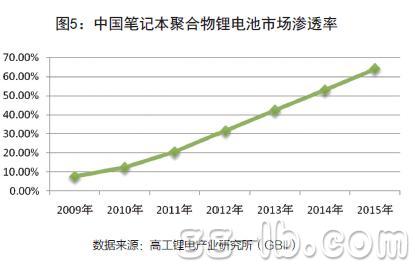 據(jù)高工鋰電產(chǎn)業(yè)研究所(GBII)統(tǒng)計(jì),2009年全球筆記本電池采用聚合物電池的比例僅為7.6%。到2012年,聚合物鋰離子電池在筆記本電腦中的滲透率已經(jīng)達(dá)到了31.5%。預(yù)計(jì),聚合物鋰離子電池的市場滲透率在2015年將達(dá)到64%。(圖5)聚合物鋰離子電池作為未來幾年數(shù)碼電池發(fā)展的方向,這將給鋰電池的發(fā)展帶來很大的影響。因?yàn)椋趧?dòng)力鋰電池、大型儲(chǔ)能市場還未大規(guī)模打開的情況下,手機(jī)電池仍然將作為鋰電池的最為主要的應(yīng)用領(lǐng)域。同時(shí),手機(jī)鋰電池應(yīng)用結(jié)構(gòu)的變化,將毫無疑問給其他數(shù)碼產(chǎn)品鋰電池的的應(yīng)用結(jié)構(gòu)帶來影響。