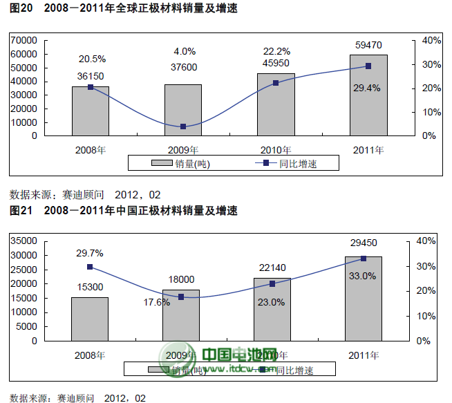 受益于鋰離子電池需求量的擴大,正極材料近幾年得到了很好的發展,2011年全球正極材料的銷量達到了59470噸,而中國的正極材料銷量占全球銷量的49.5%,達到29450噸。