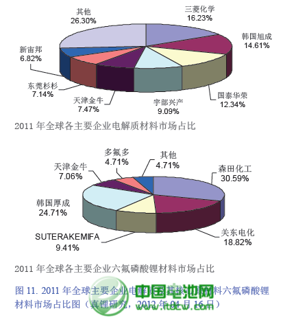 與負極材料領域產能和市場份額日漸集中的發展趨勢明顯不同的是,鋰離子電池電解液 材料市場格局則呈現出一定的渾濁現象。近兩年的鋰離子電池電解液市場發展情況顯示,該 領域的市場格
