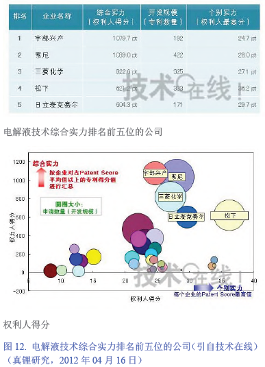 中國電池網-中國電池雜志戰略合作機構——真鋰研究提示,這里插入提及,針對鋰離子電池制造中使用的有機電解液,總部位于東京的Patent Result曾于2010 年08 月根據專利分析公布了涉足企業的競爭狀況調查結果,調查范圍是1992 年01 月以后申請、1993 年~2010 年04 月底公開的專利公報。調查結果顯示,宇部興產申請了192 項,雖數量位居第六,但該公司擁有較多的高關注度專利,在綜合實力上高居榜首。