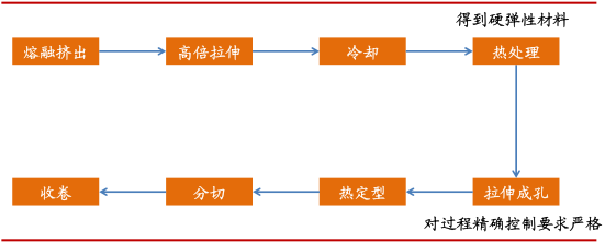 該工藝對過程精密控制要求高,尤其是拉伸溫度高于聚合物的玻璃化溫度而低于聚合物的結晶溫度。