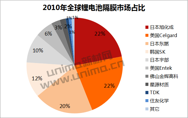 根據IIT的統計,從2010年隔膜廠商的市場份額來看,日本和美國占據了絕對的主導地位,總體份額超過了70%,韓國SK也占據了全球市場約12%的份額。