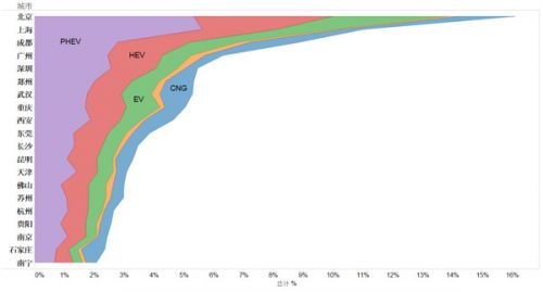 上海市并未對插電式混合動力汽車做出限制,上海市政府于2012年12月29日發布了《私人購買新能源汽車試點財政補助資金管理暫行辦法》,其中的相關政策包括免費牌照和最高4萬元的補貼,被列入上海鼓勵私人購買和使用新能源汽車試點的車輛包括了“插電式混合動力車”和“純電動車”,私人用戶在購買新能源車后,將由上海機動車額度審查部門免費發放專用牌照,監測數據顯示出上海用戶的關注度明顯高于其它城市。