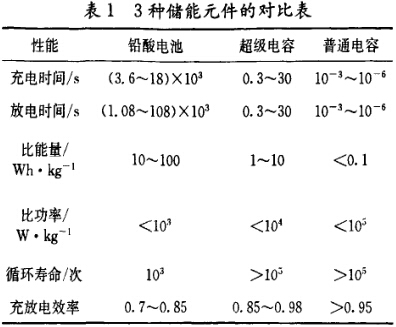 超級電容具有極其優(yōu)良的充、放電性能,在額定電壓范圍內(nèi),可以以極快的速度充電至任一電壓值,放電時則可以放出所存儲的全部電能,而且沒有蓄電池快速充電和放電的損壞問題。此外,超級電容還具有不污染環(huán)境及機械強度高、安全性好(防火、防爆)、使用過程中免維護、使用壽命長(大于10年)和工作溫度范圍寬(一30℃~ 45℃)等優(yōu)點,并且在瞬間高電壓和短路大電流情況下有緩沖功能,能量系統(tǒng)較為穩(wěn)定。超級電容與鉛酸電池和普通電容的性能對比見表1。