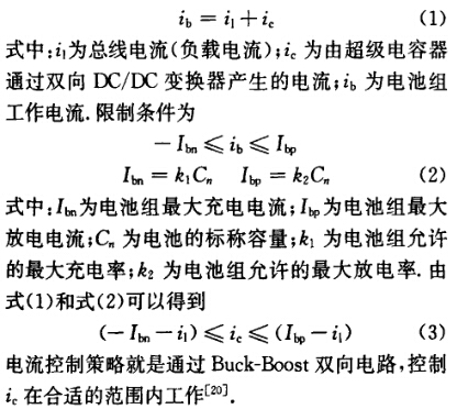 電動車在行駛過程中,由于頻繁地加速、減速和上下坡等原因,使得負載電流變化比較大,當負載電流太大以至于超過蓄電池所能承受的最大放電或充電電流時,為了避免電池組過放電或過充電,需要由超級電容放電或充電,以便改善電池組的工作狀態,延長其使用壽命。電池組的工作電流為
