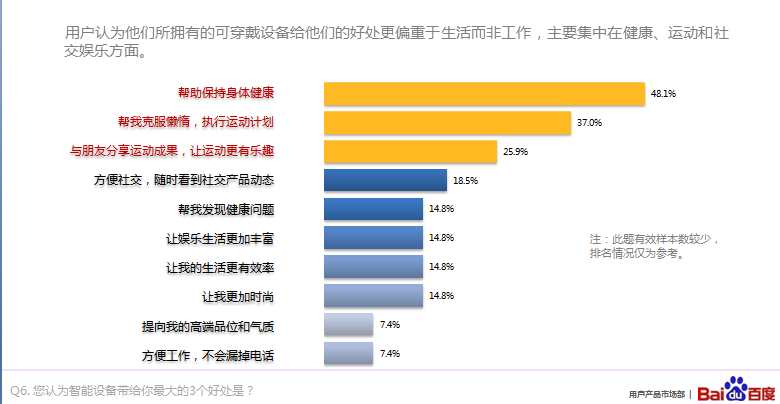 有這么大的購買意愿,用戶最需要什么樣的可穿戴設備呢?據百度的調研報告顯示,和電腦、手機、平板等傳統數碼設備相比,可穿戴設備似乎更有針對性,大多數用戶更期望可穿戴設備能夠在健康和運動方面帶來幫助,其次才是工作效率和娛樂。百度調查指出,在用戶期待的可穿戴設備的前十大功能中,“幫助保持身體健康”排名第一,占比高達 62%,第二位功能是“幫我克服懶惰,執行運動計劃”,占比 37.4%;“幫我發現健康問題”功能排名第三位,占比 31.4%。剩余七項功能是:讓我工作生活更有效率,讓娛樂生活更加豐富,與朋友分享運動成就,方便工作,體現我的高端品位和氣質,以及方便社交,讓我更加時尚。