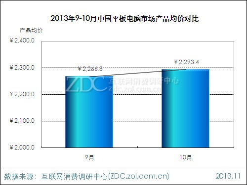 10月平板電腦市場上,ZDC統(tǒng)計數(shù)據(jù)顯示,整體市場均價為2293.4元看,較9月上升26.6元,漲幅1.2%。本月共有24款產品降價,占產品總數(shù)的3.9%。從產品均價變化看,本月整體市場并沒有受到黃金周的沖擊,市場均價相對保持穩(wěn)定。