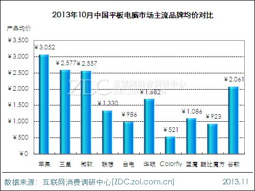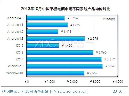 2013年10月中國平板電腦市場上,整體市場產品均價保持穩(wěn)定,主流品牌中蘋果產品均價相對較高,三星與微軟基本持平。細分市場上,國產品牌產品均價較9月下降5.3%,反映出本月國產平板電腦產品價格變化幅度較大。產品參數(shù)方面,Android系統(tǒng)平板電腦占據(jù)價格優(yōu)勢。