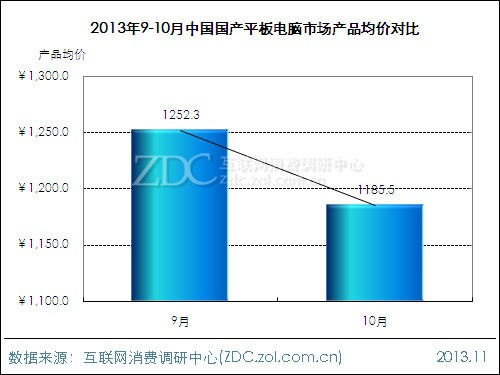 ZDC統(tǒng)計數(shù)據(jù)顯示,10月國產平板電腦市場產品均價出現(xiàn)下滑,由9月的1252.3元下滑至10月的1185.5元,降幅為5.3%。從國產市場產品均價變化來看,本月國產平板電腦在十一假期的促銷力度較大。