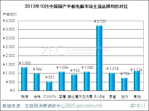 10月平板電腦市場上,國產品牌中,高端商務品牌E人E本以接近4000元的產品均價高居各主流品牌首位,聯(lián)想與藍魔分別排在第二、三位,產品均價為1330元和1086元。整體來看,國產品牌平板電腦主要以千元機為主。