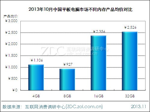10月平板電腦市場上,ZDC統(tǒng)計數(shù)據(jù)顯示,內存容量為32GB和16GB的平板電腦產品均價都在2000元以上。與前兩者相比,4GB與8GB內存產品價格相對較低,其中8GB內存平板電腦產品均價不足1000元。