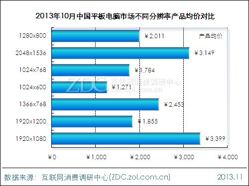 10月平板電腦市場上,ZDC統(tǒng)計數(shù)據(jù)顯示,分辨率為1920x1080和2048x1536的平板電腦產品均價都在3000元以上,其中1920x1080產品均價相對最高。整體來看,平板電腦市場上高分辨率產品都伴隨著高價位,因此如果對于視覺感受沒有過高要求的用戶來說,1024x768分辨率產品會是一個折中的選擇。