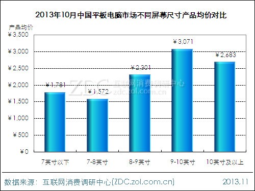 ZDC統(tǒng)計數(shù)據(jù)顯示,10月屏幕尺寸在7-8英寸之間的平板電腦產品均價為1572元,與其它屏幕尺寸產品相比,更適合大眾消費者。與之相比,9英寸以上平板電腦產品均價都在2500元以上,產品多以高端機型為主。