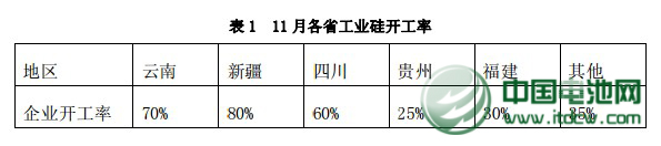 隨著枯水期臨近,各地開工率出現(xiàn)不同程度的下滑。四川開工率較上月下滑 20%,停爐地區(qū)主要集中在四川德昌和雅安;云南地區(qū)盡管本月仍在正常生產(chǎn), 但從 12 月 1 日起將有大批企業(yè)被迫停產(chǎn)。除新疆外,預(yù)計(jì) 12 月其余地區(qū)工業(yè)硅 開工率會(huì)下降至 40%以下。